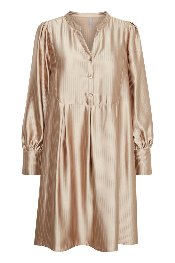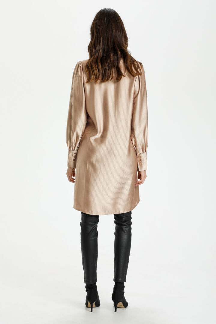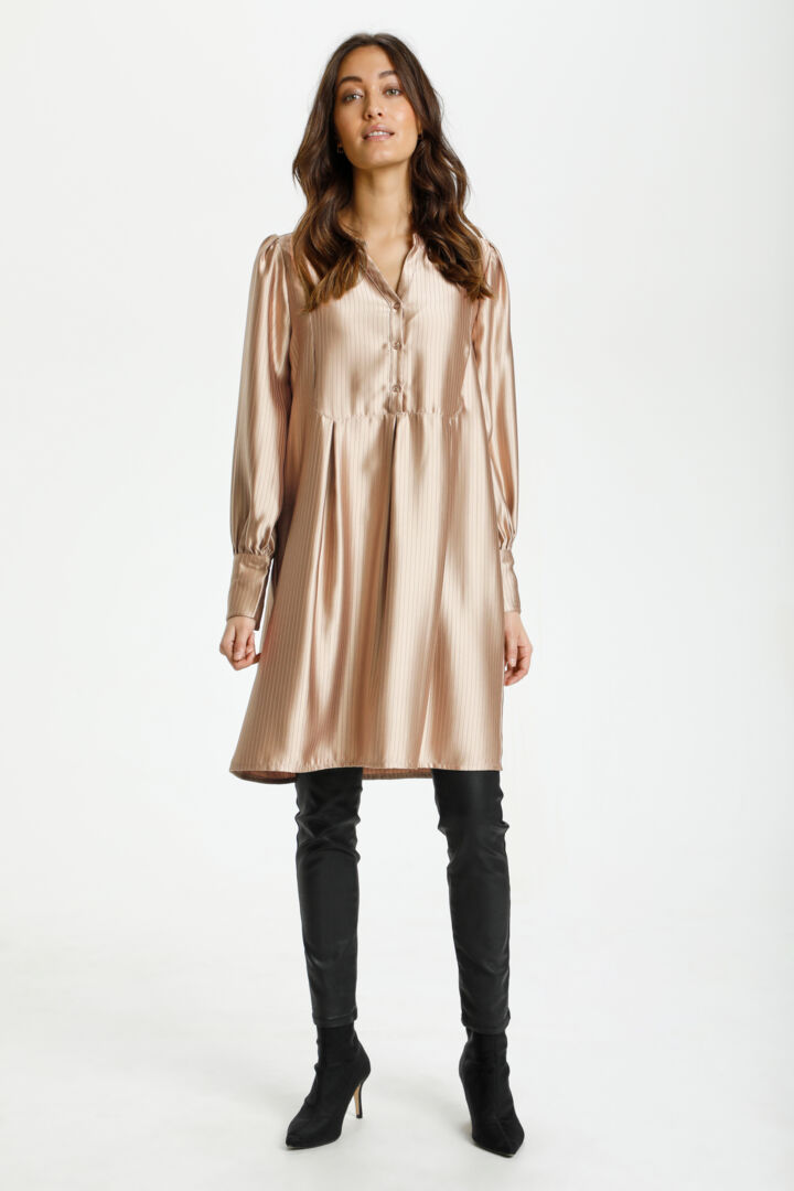 En riktigt snygg klänning som passar perfekt till festen, afterwork eller när man bara vill vara vardagsfin. Du kan även bära den över ex. ett par snygga skinnbyxor, tights. Klänningen har knappar upptill och är avskuren i midjan samt breda manschetter nedtill på ärmarna.