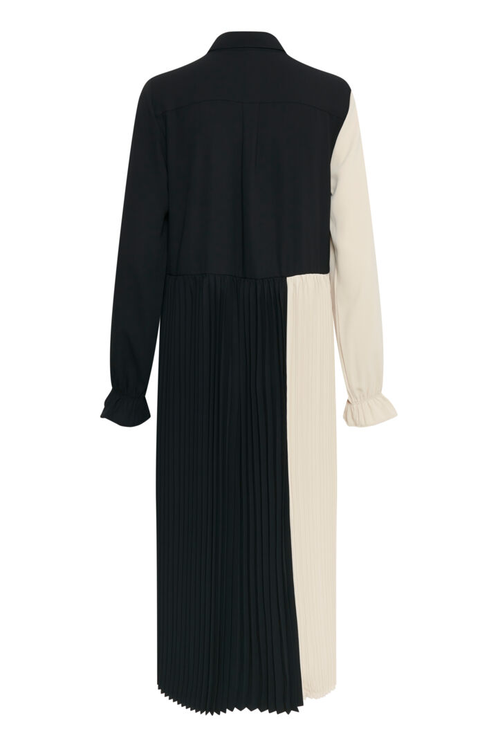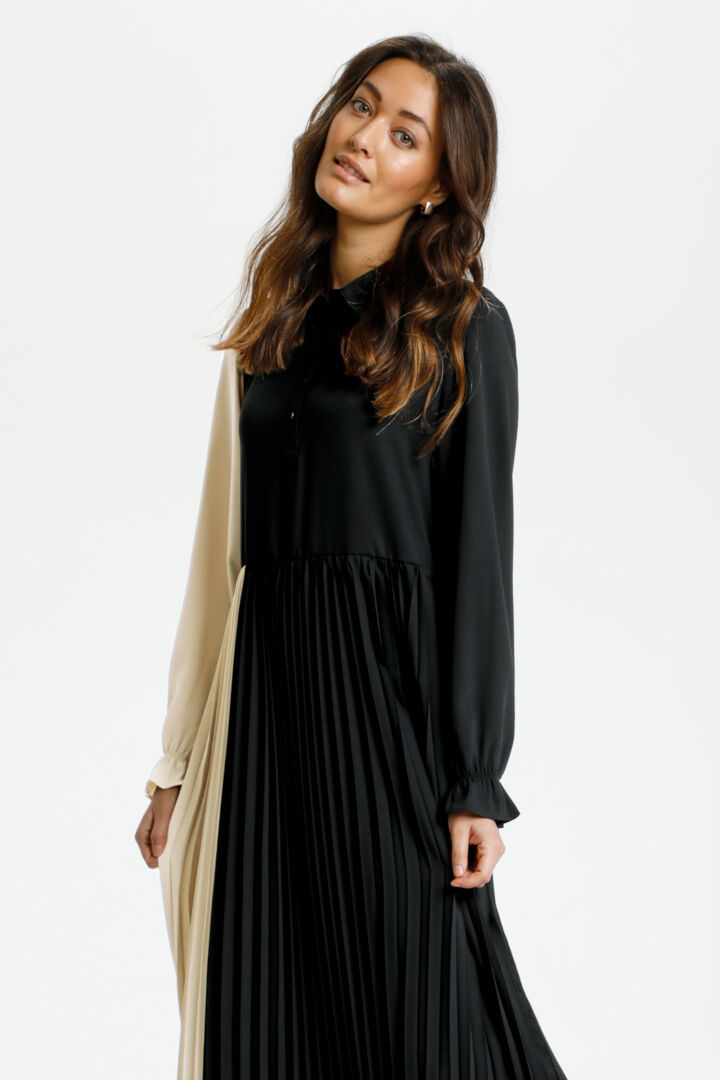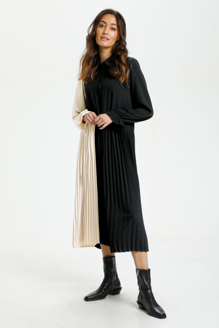 Den här klänningen är en riktig utstickare. Så snygg med kontrasten av det svarta och ljust beiga. Klänningen är i en löst sittande modell avskuren i midjan och nederdelen är plisserad och övre delen i skjortmodell. Bär den coolt till ett par kängor eller mer uppklätt med stövlar el. klackar.