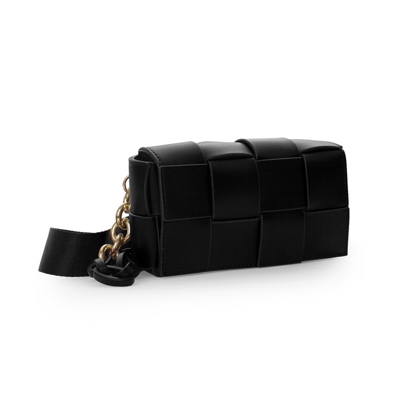 En elegant mindre flätad axelremsväska som stängs med dolda magneter. Tre avtagbara axelremmar ingår, ett reglerbart bredare band som är gjord av återvunna PET-flaskor. Två smalare i samma material som väskan där ena används som axelrem och den andra som midjeväska.