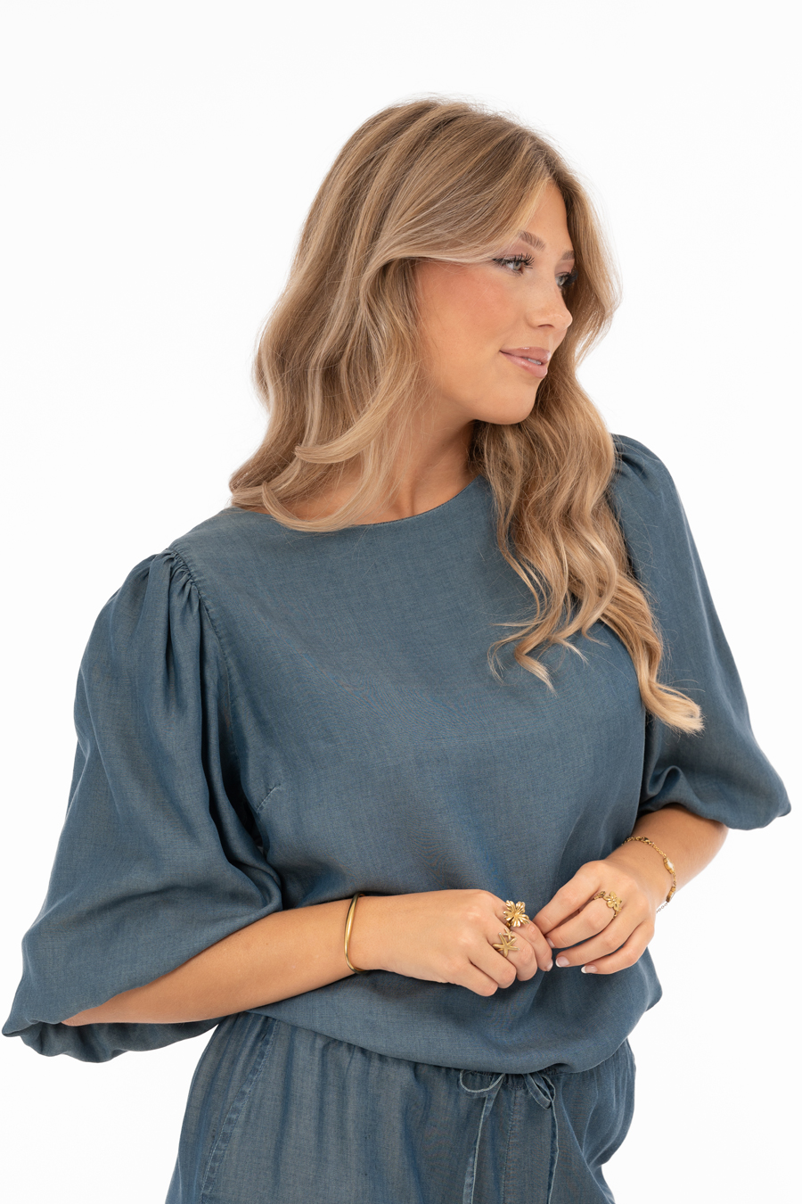 Tencel-blus i tunn denim med puffärmar och 3/4-längd. Ledig passform och mjuk resår i ärmslut – en stilren och bekväm vårblus i hållbart material.