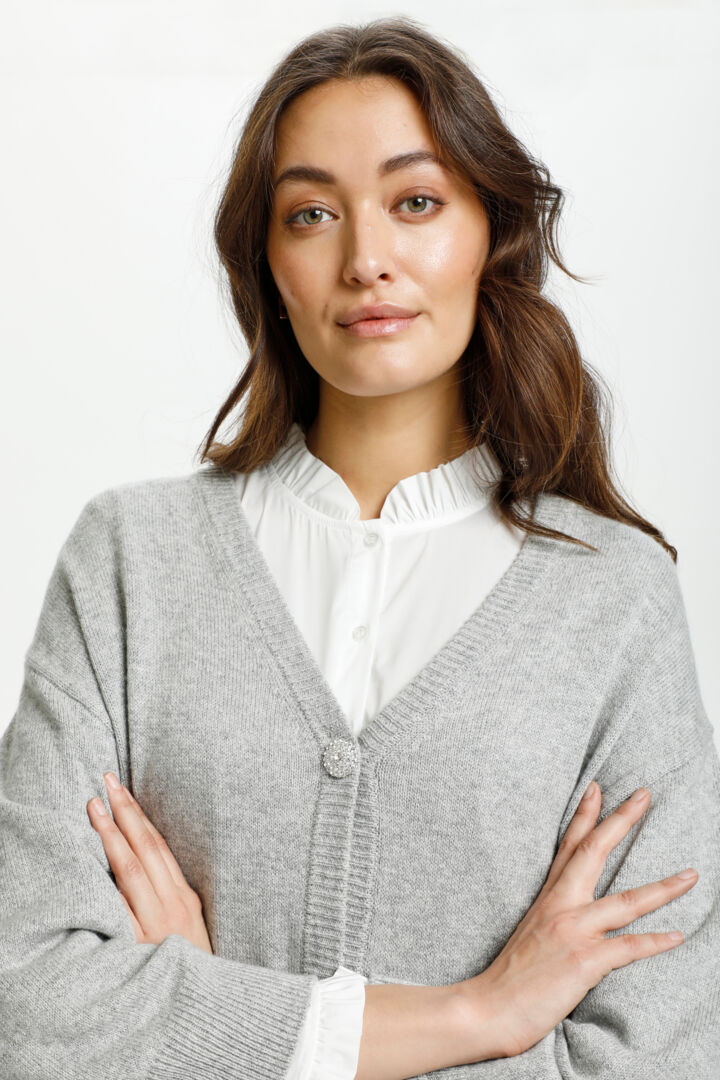 Kofta i lite längre modell, längre ärm och med v-ringad hals och stora knappar i strass som vi ser mycket nu.