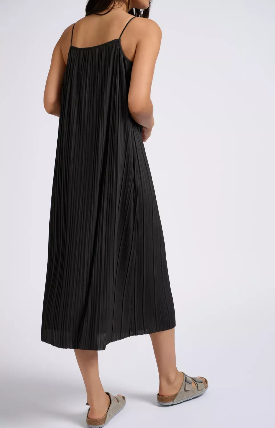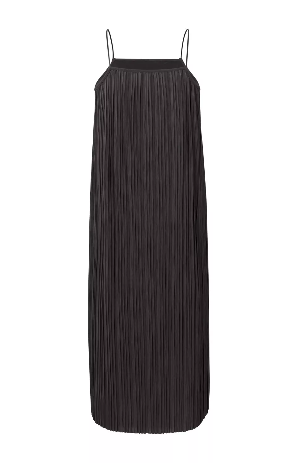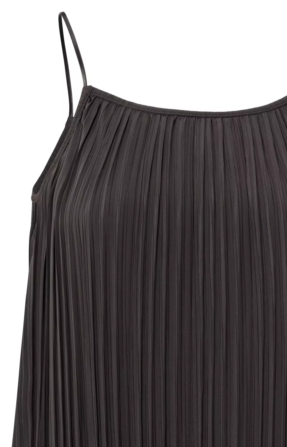 En härlig, lyxig klänning. Plisserad och i en kvalité som gör att den hänger lite tyngre och får ett bra fall. Fodrad. Axelband i fake leather.