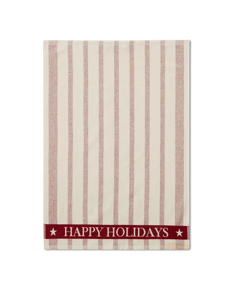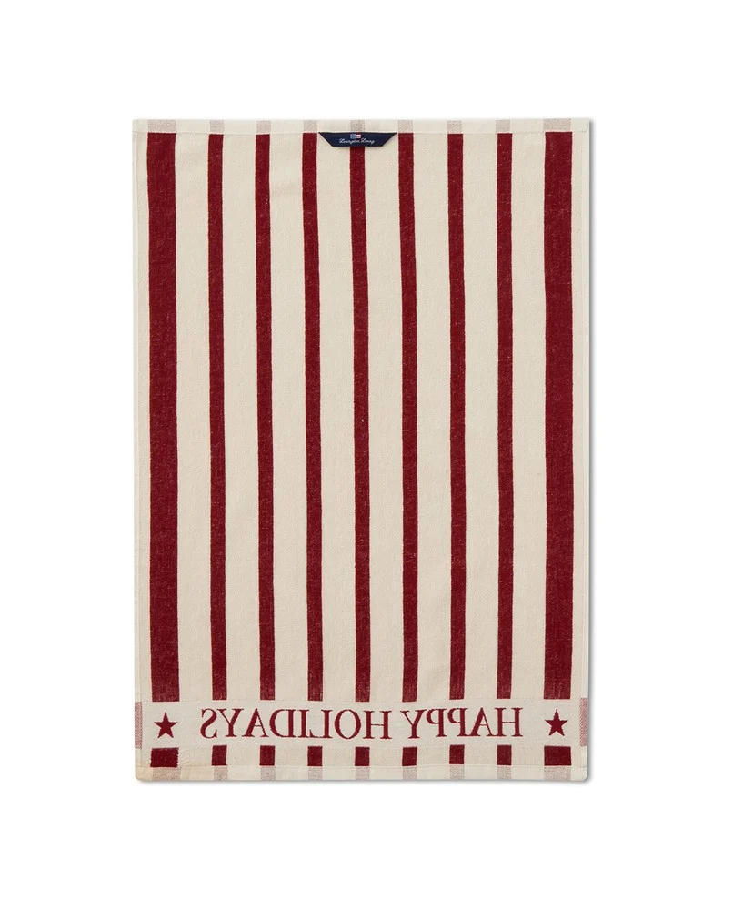 Vår superabsorberande kökshandduk i bomullsfrotté står redo att torka upp allt spill i köket. Den är med sina klassiskt röda och vita ränder och texten “Happy Holidays” i jaquardväv det perfekta sällskapet för att svänga ihop en härlig jul- eller nyårsmiddag för nära och kära. Den har en enkel vikt fåll och logotypförsedd upphängningsögla som gör den enkel att torka. OEKO-TEX®-certifiering garanterar att inga skadliga ämnen finns i textilen, vilket gör att den tryggt kan användas vid matlagning.