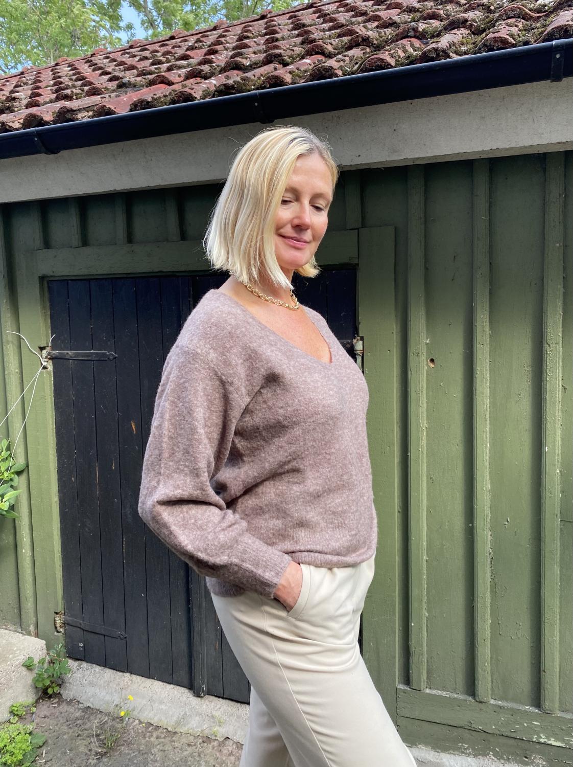 V-ringad tröja med ballongärm. Superskön kvalité och så snygg ljust brunmelerad färg.