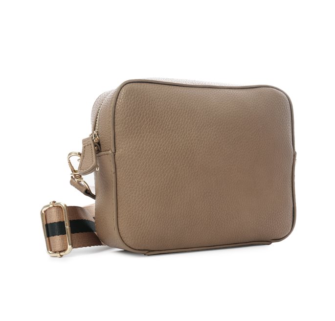 Mindre axelremsväska som passar både till vardag och till fest. Två axelremmar ingår, en smalare i samma material som väskan och ett reglerbart, bredare band som är gjord av återvunna PET-flaskor.