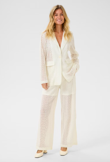 Denna spetsblazer har en skräddarsydd passform med slag, fickor med lock och en knappstängning. Den semitransparenta designen ger en feminin känsla – perfekt för lager på lager eller som set. Modellen är 177 cm lång och bär storlek 38.