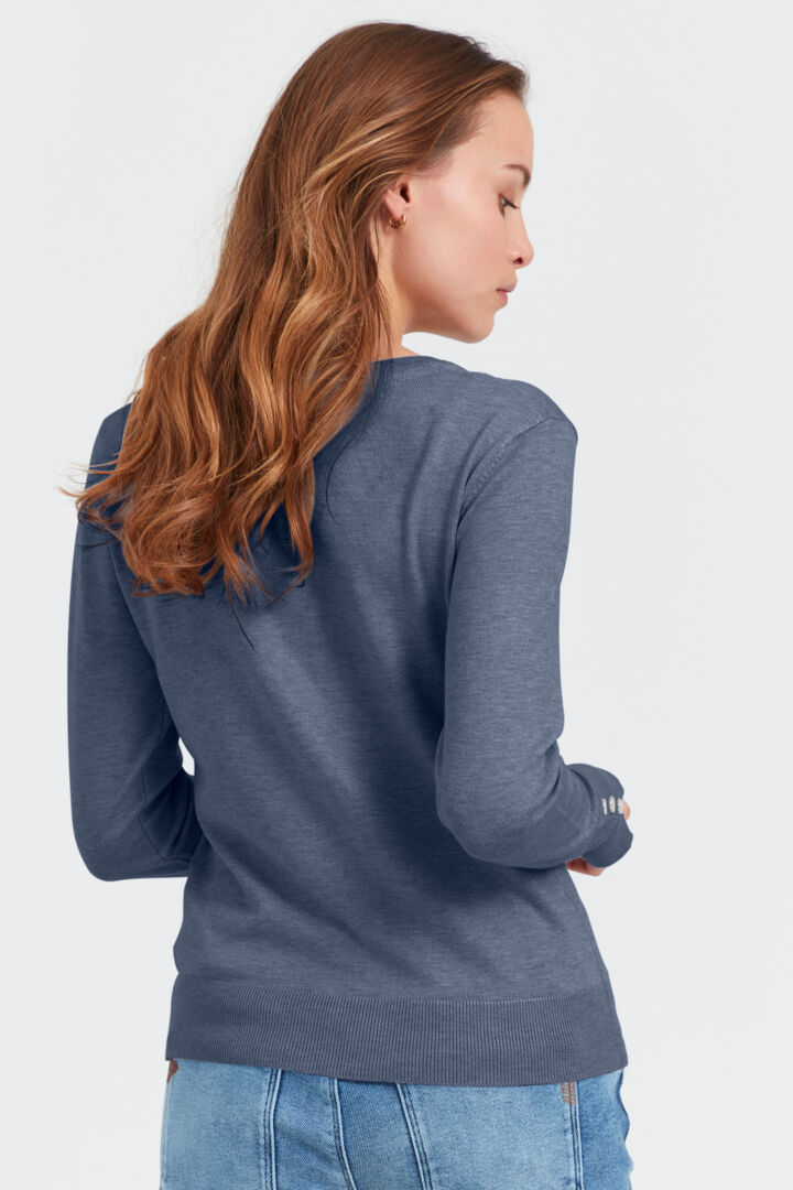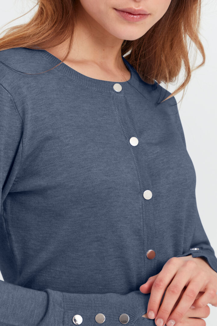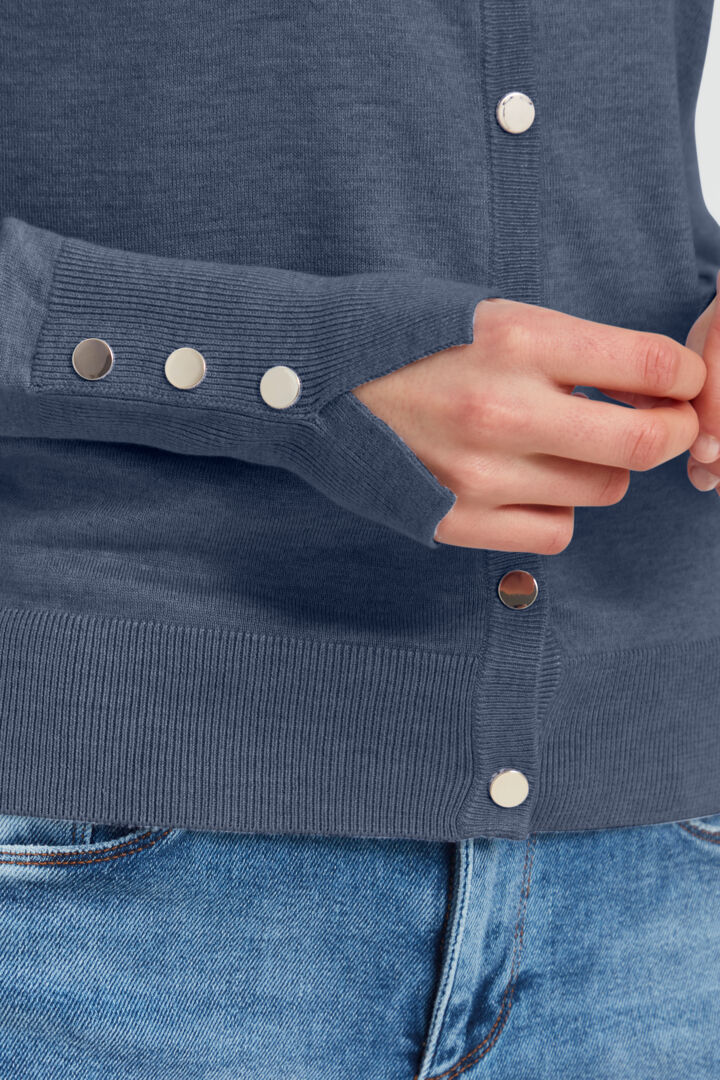 Fin, slätstickad kofta i en snygg jeansblå färg. En klar favorit blir den här koftan. När man köpt en färg så återkommer man garanterat och vill ha fler färger. Håller formen och finishen superbra.