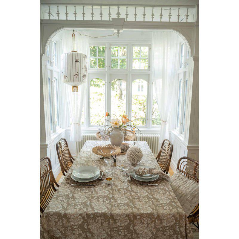 Duk i bomull med ett magnifikt mönster och vacker bård längs långsidorna. En duk i ljuva färger som förhöjer rummets atmosfär.