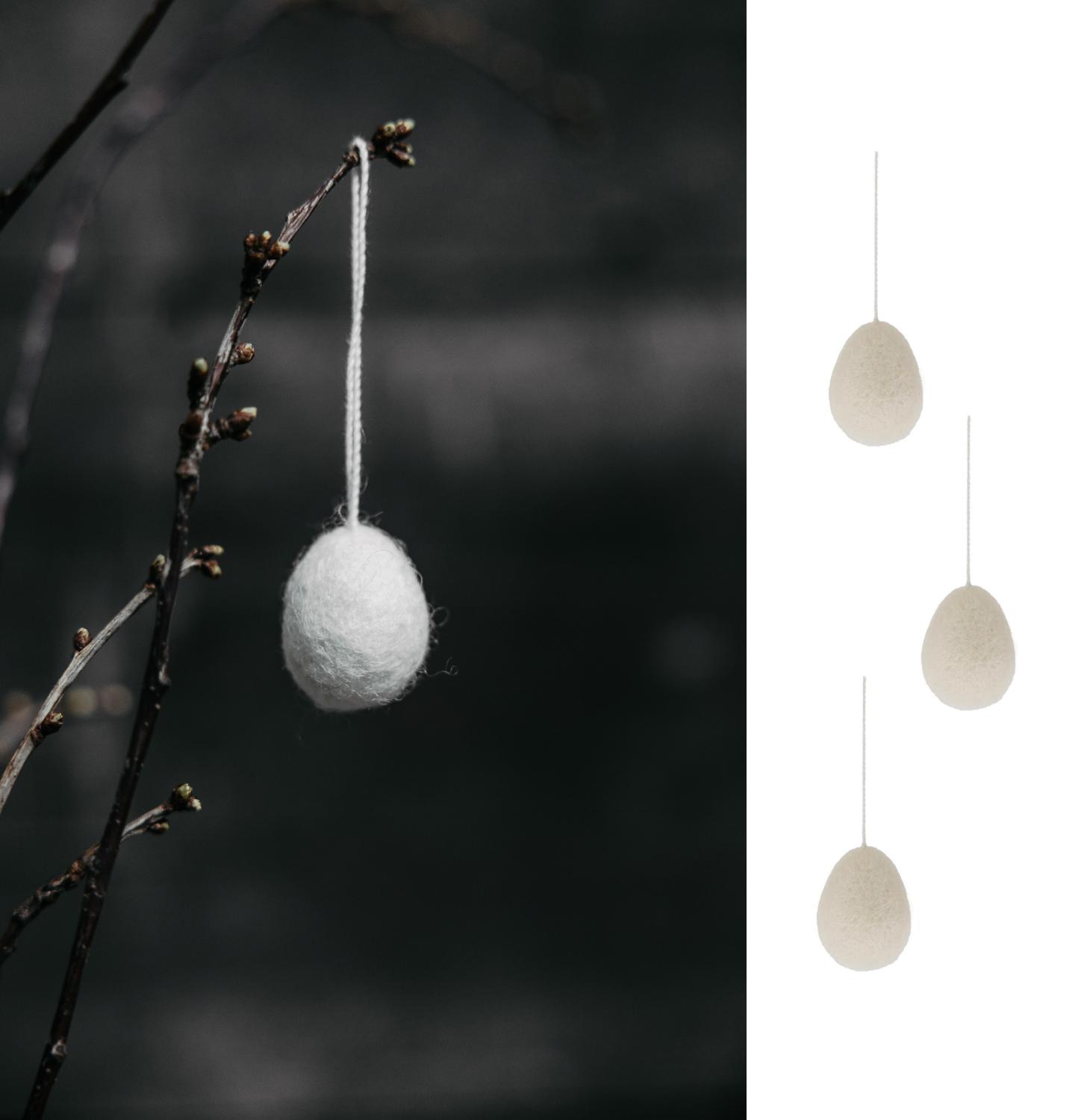 Vitt tovat ägg med hängsmycke. Passar utmärkt i påskriset, på presenten eller som dekoration på byrån. Du kan även klippa bort banden om du föredrar att använda äggen som liggande dekoration.