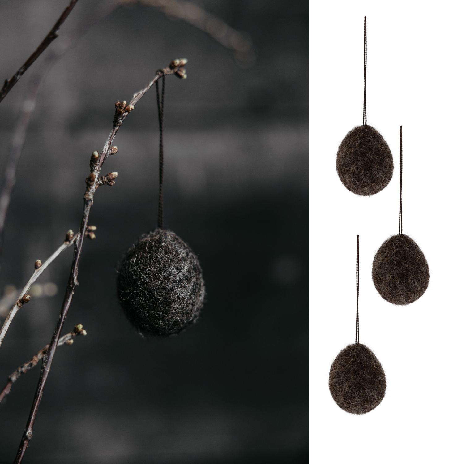 Mörkbrunt tovat ägg med hängsmycke. Passar utmärkt i påskriset, på presentinslagningen eller som dekoration på byrån. Du kan även klippa bort eller gömma banden om du föredrar att använda äggen som liggande dekoration.